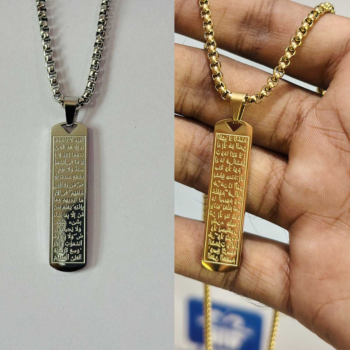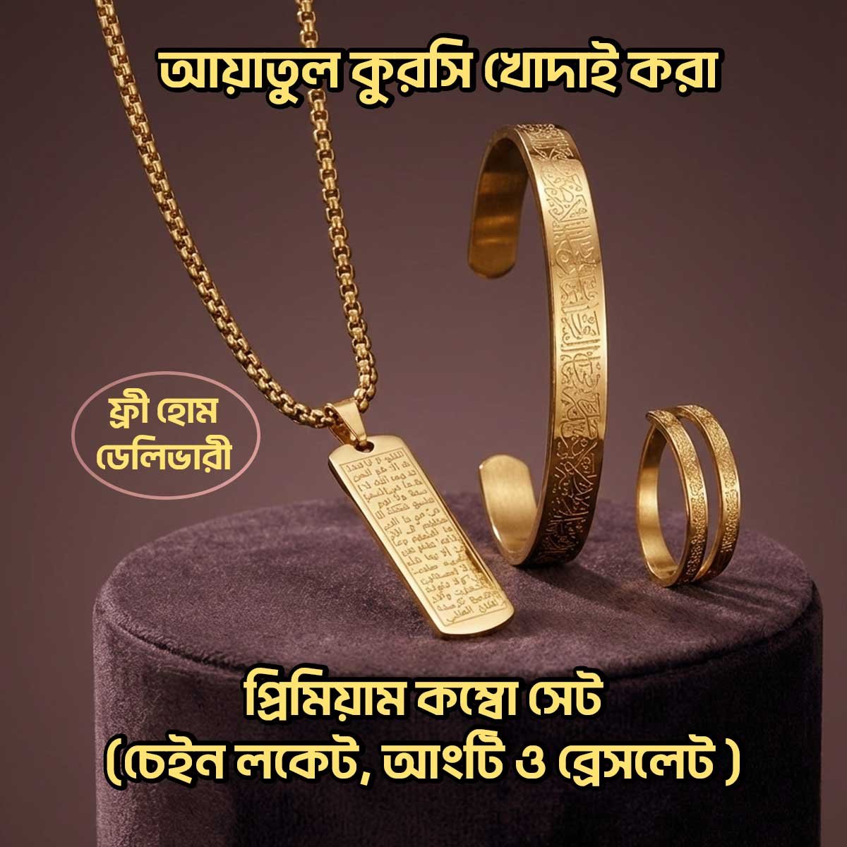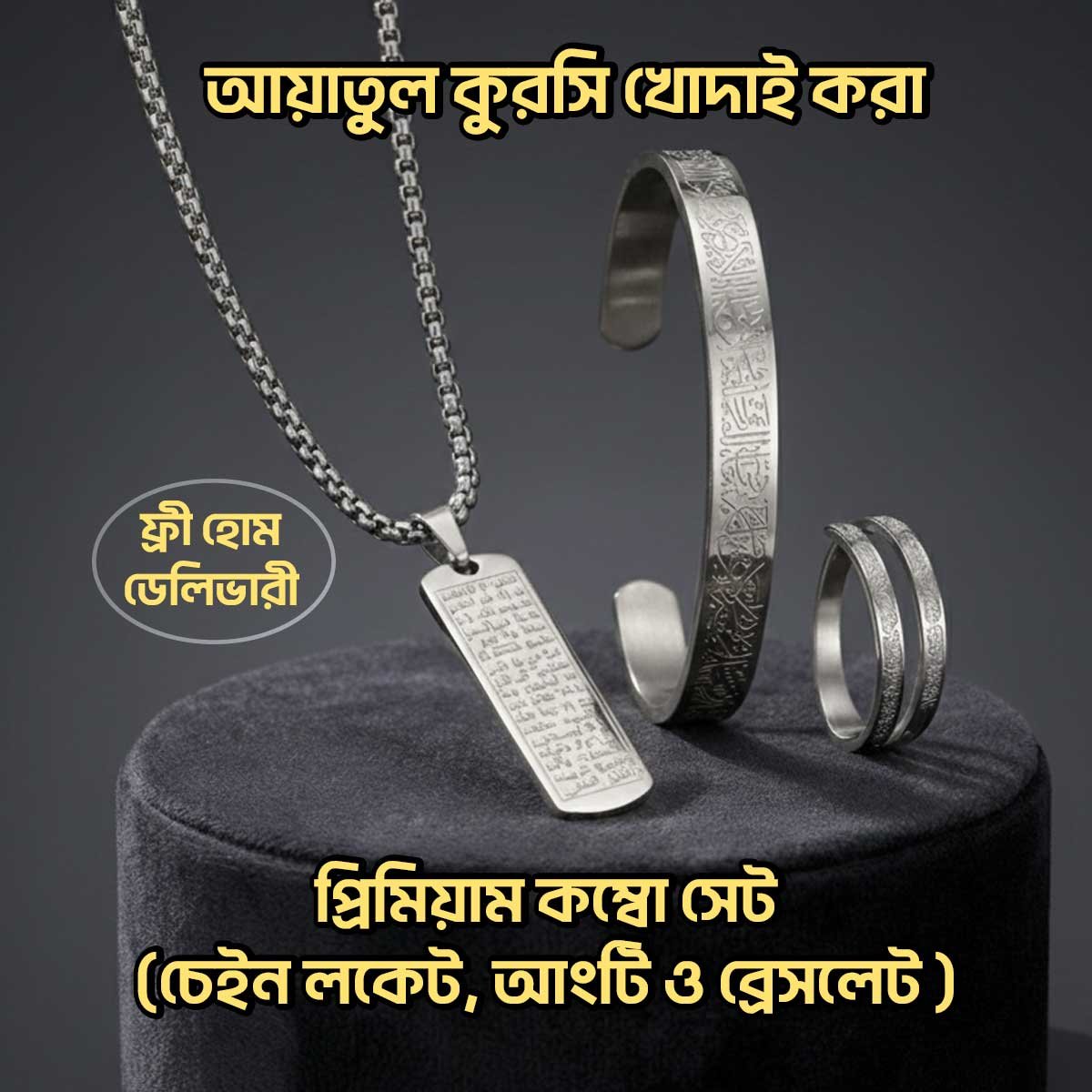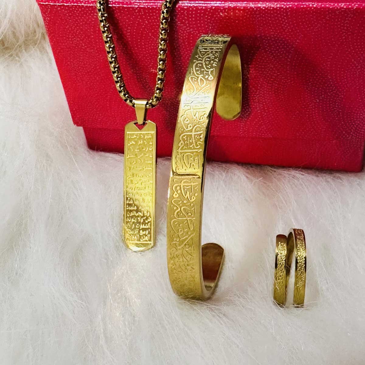 আয়াতুল কুরসি খোদাই করা প্রিমিয়াম কম্বো সেট – চেইন লকেট, আংটি ও ব্রেসলেট | ১০০% স্টেইনলেস স্টিল